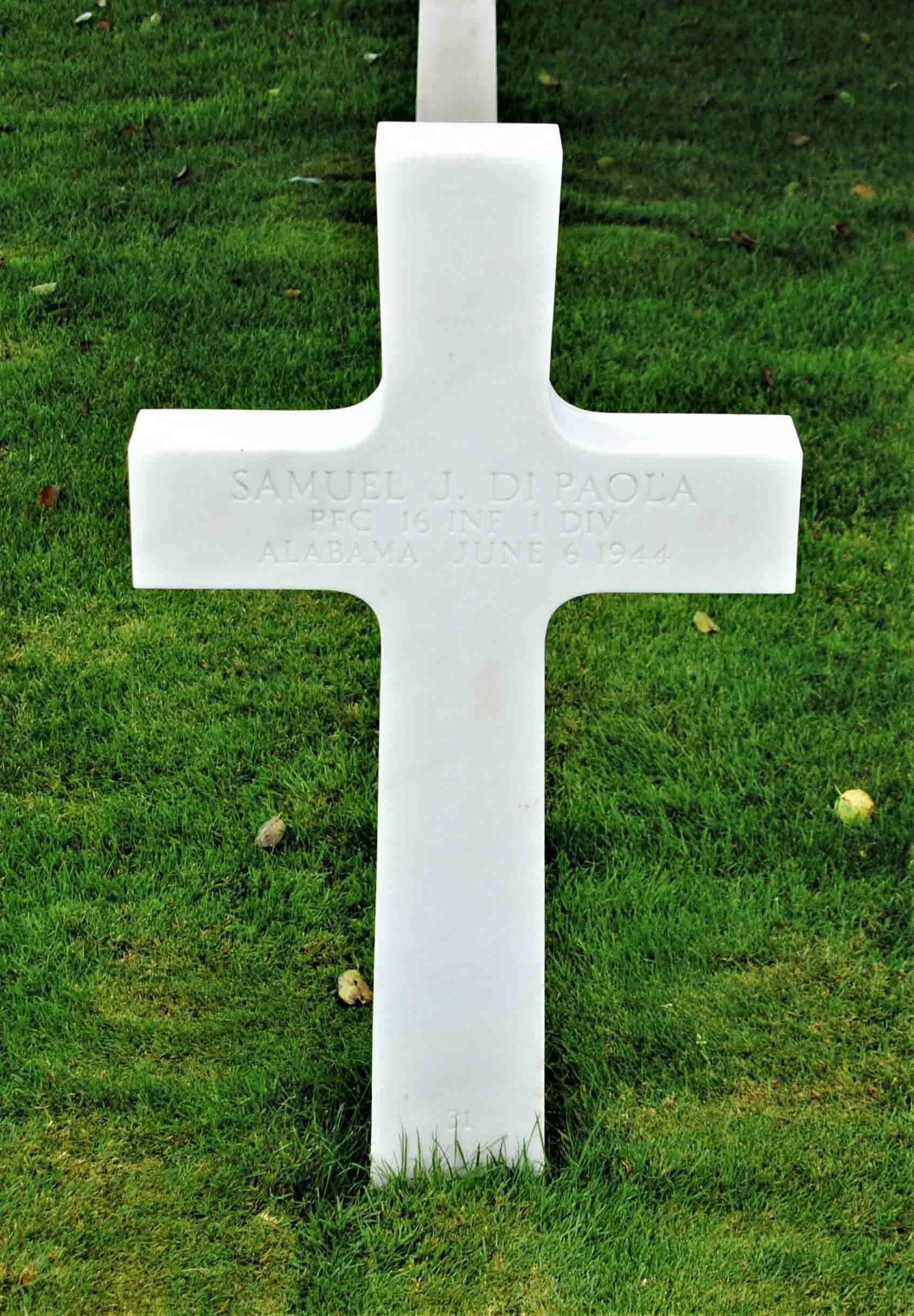 Samuel J. Di Paola entered the military service in Alabama. He served in the U.S. Army during World War II as a Private First Class in the 16th Infantry Regiment, 1st Infantry Division. He died on June 6, 1944 during the invasion on Omaha Beach, France and is now buried in Normandy American Cemetery, Colleville-sur-Mer, France.