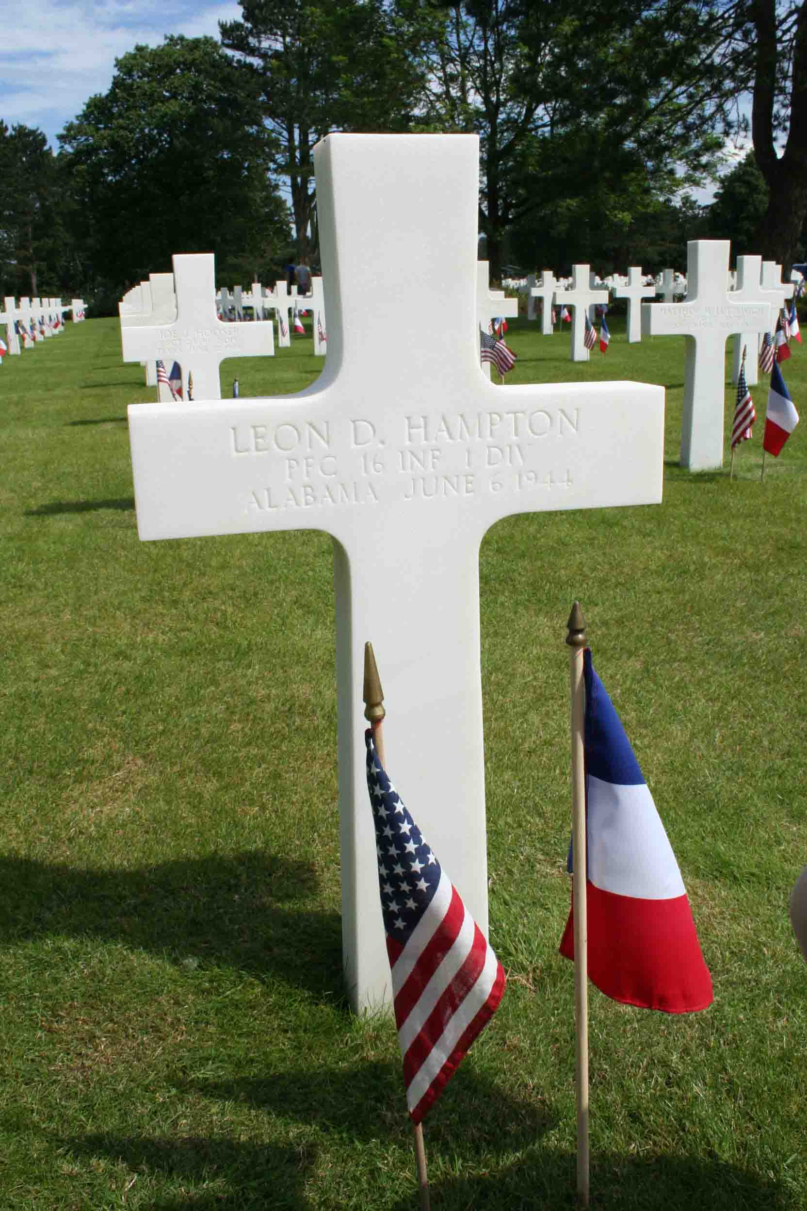 Leon D. Hampton entered the military service in Alabama. He served in the U.S. Army during World War II as a Private First Class in the 16th Infantry Regiment, 1st Infantry Division. He died on June 6, 1944 during the invasion on Omaha Beach, France and is now buried in Normandy American Cemetery, Colleville-sur-Mer, France.