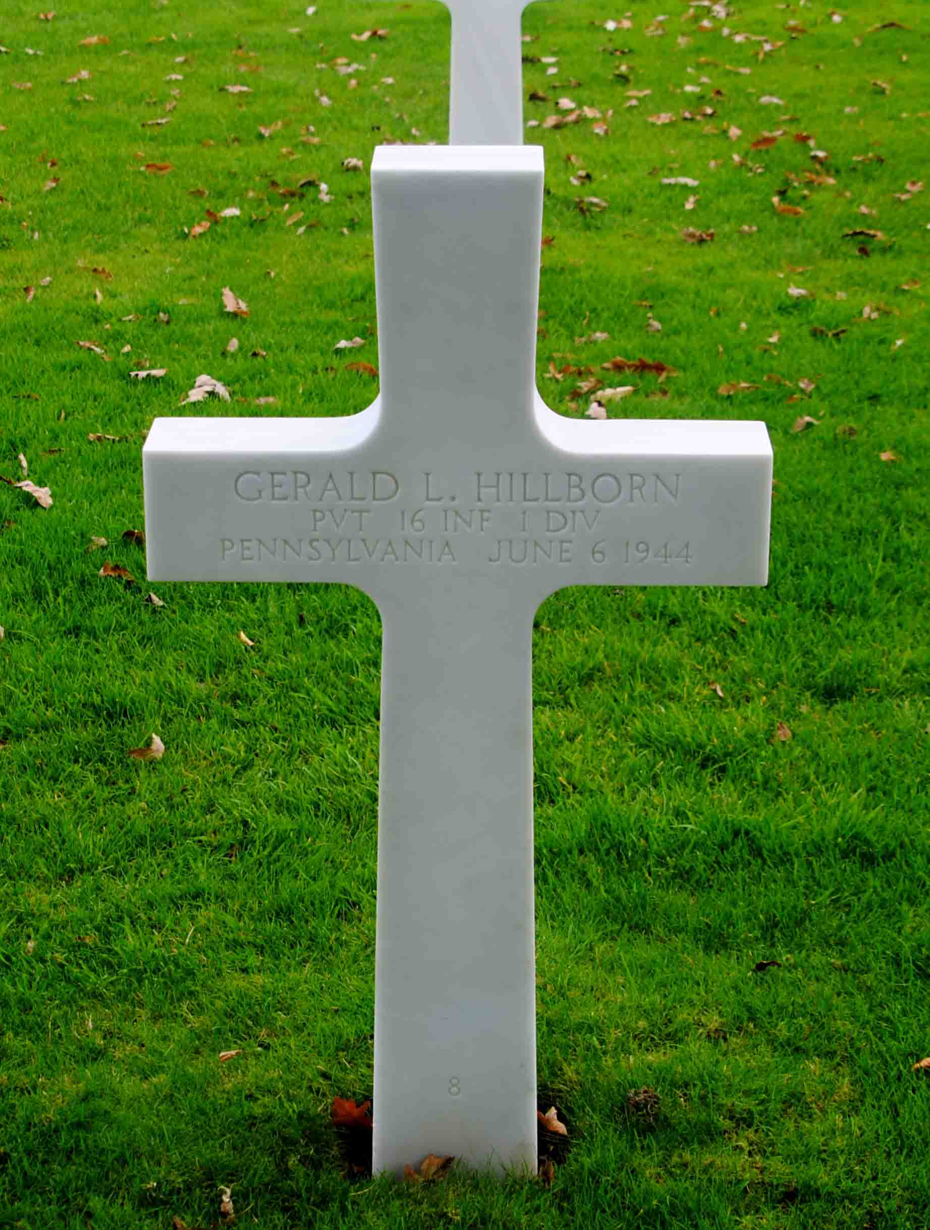 Gerald L. Hillborn was born on February 5, 1910 in Allentown, Lehigh County, Pennsylvania. He served in the U.S. Army during World War II as a Private in the 16th Infantry Regiment, 1st Infantry Division. He died on June 6, 1944 during the invasion on Omaha Beach, France and is now buried in Normandy American Cemetery, Colleville-sur-Mer, France.