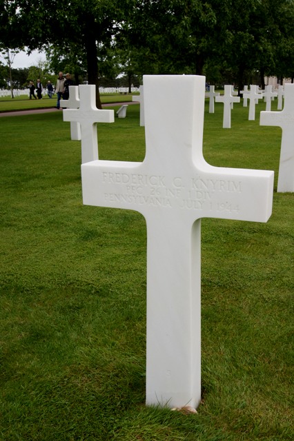 Frederick C. Knyrim was born on March 14, 1921 in Hazleton, Luzerne County, Pennsylvania. He was the son of Christian Knyrim and Hilda E. Ehmer Knyrim. He graduated from Hazleton High School in 1939 and was employed at the Duplan Silk Co. plant here before his induction. He was also a member of the Grace Reformed church. Fredercick entered the service on June 19, 1942 and received his training at Fort Meade, Md., Camp Lee, Va., and Camp Kilmre, New Jersey. He was sent overseas in November, 1942. He participated in both the entire North African and Sicilian campaigns and was stricken with malaria after both campaigns, recovering at rest camps. After the Sicilian campaign he was sent to England and from there to France. He served in the U.S. Army during World War II as a Private First Class in the 26th Infantry Regiment, 1st Infantry Division. Frederick was Killed in Action on July 1, 1944 in France at the age of 23 and is now buried in Normandy American Cemetery, Colleville-sur-Mer, France. He also has a cenotaph located in St. John's Cemetery, Luzerne County, Pennsylvania.