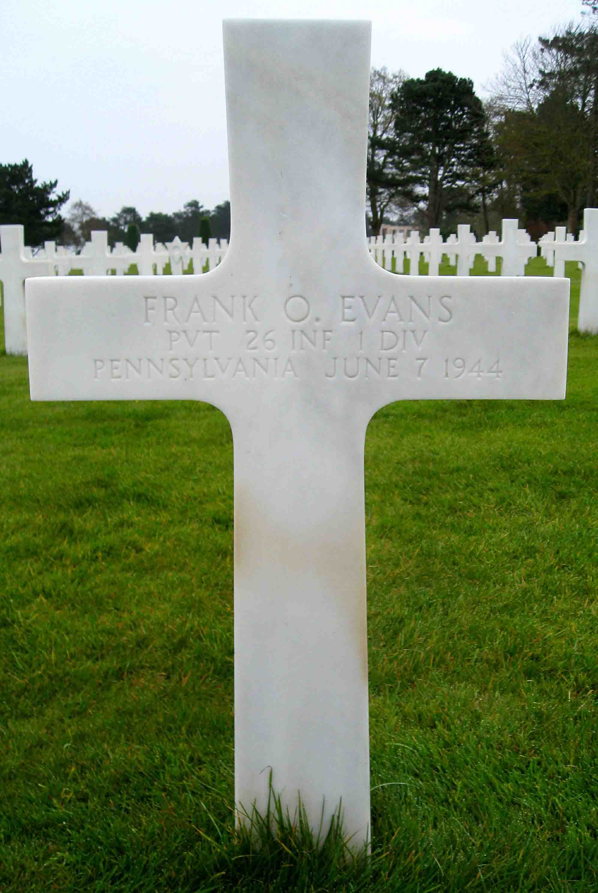 Frank O. Evans was born on November 29, 1924 in Pottstown, Montgomery County, Pennsylvania. He served in the U.S. Army during World War II as a Private in the 26th Infantry Regiment, 1st Infantry Division. He died on June 7, 1944 and is now buried in Normandy American Cemetery, Colleville-sur-Mer, France.