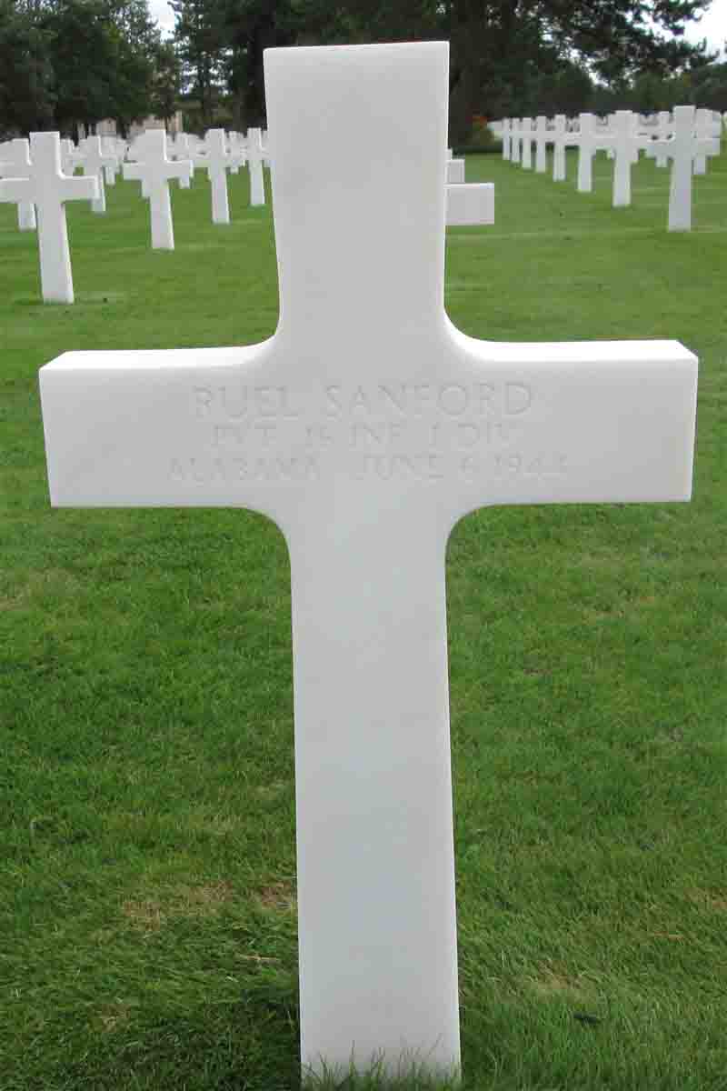 Ruel Sanford was the son of David Sanford and Margaret Sanford. He entered the military service in Alabama and served in the U.S. Army during World War II as a Private in the 16th Infantry Regiment, 1st Infantry Division. He died on June 6, 1944 during the invasion on Omaha Beach, France and is now buried in Normandy American Cemetery, Colleville-sur-Mer, France.
