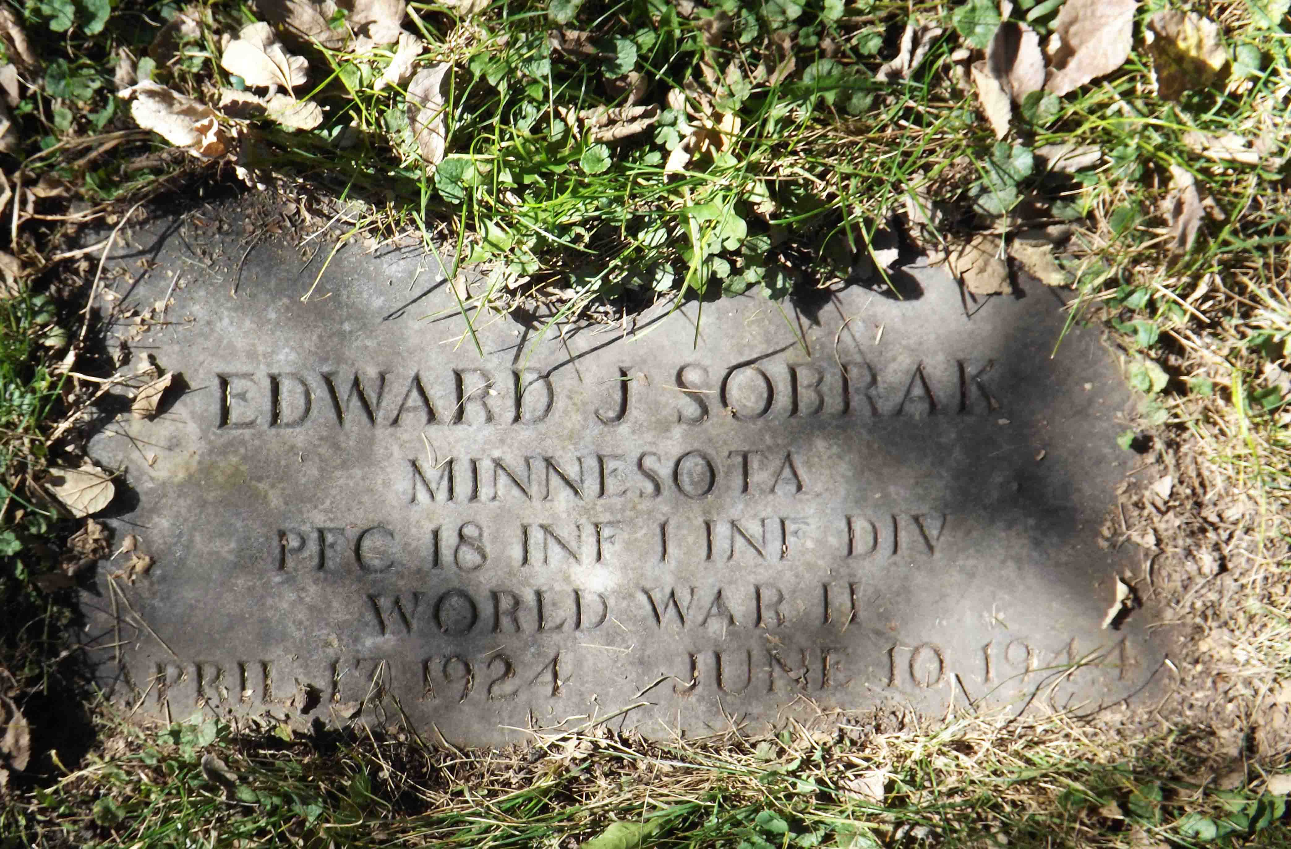 Edward J. Sobrak was born on April 3, 1924 in Faribault, Rice County, Minnesota. He was the son of Thomas Sobrak and Clara LaJeunesse Sobrak. He attended the local schools and on November 20, 1942 was inducted into military service of the United States at Fort Snelling. He received his miliary training at Camp Knox, Camp Campbell, Tenn., and in Pennsylvania, and was sent overseas where he landed at Casablanca. He served in the Tunisian and Sicilian campaigns before being return to England to prepare for the invasion of Normandy. It was during this campaign that he was killed in action on June 10, 1944. He is now buried in Saint Lawrence Cemetery, Faribault, Rice County, Minnesota, USA.