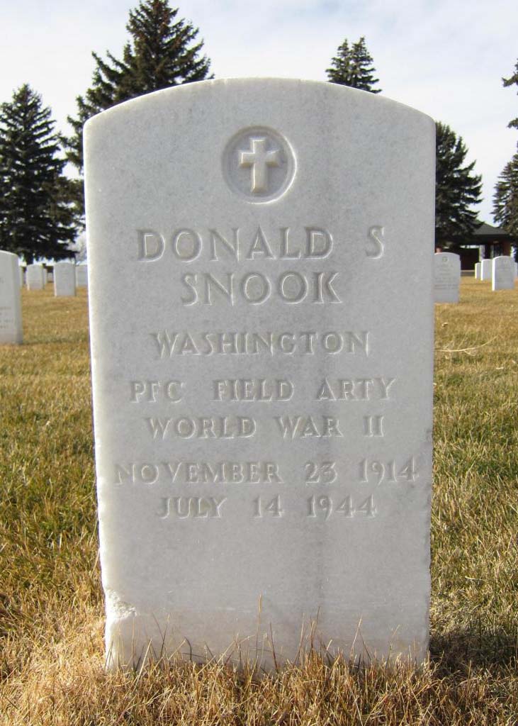 Donald Sylvester Snook was born on November 23, 1914. He served in the U.S. Army during World War II as a Private First Class in the Field Artillery of the 1st Infantry Division. He died on July 14, 1944 at the age of 29 and is now buried in Fort McPherson National Cemetery, Maxwell, Lincoln County, Nebraska, USA.