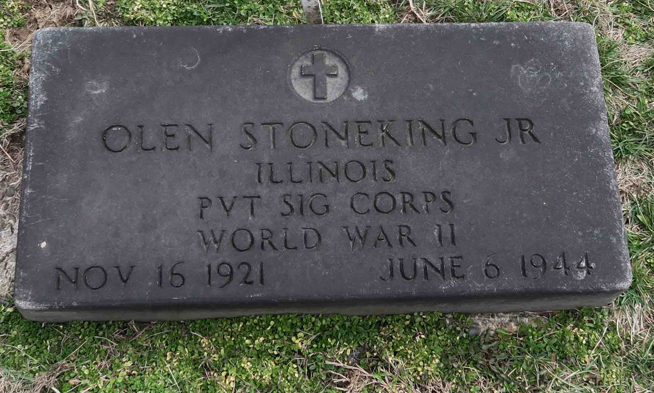 Junior Olen Stoneking was born on November 16, 1921 in Adams County, Illinois. He was the son of Mr. and Mrs. Edward Stoneking. Junior was working in construction when enlisted as in Peoria, Illinois on October 5, 1942. He served in the U.S. Army during World War II as a Private in the Signal Corps, 1st Infantry Division. He was Killed in Action on June 6, 1944 during the invasion on Omaha Beach, France at the age of 22 and is now buried in Clayton South Side Cemetery, Clayton, Adams County, Illinois, USA.