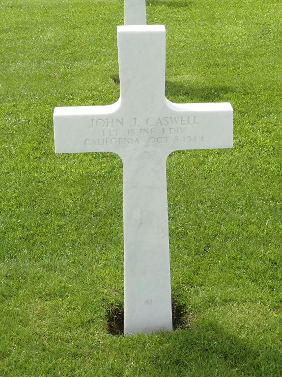 John J. Caswell entered the military service in California. He served in the U.S. Army during World War II as a First Lieutenant in the 18th Infantry Regiment, 1st Infantry Division. He died on October 8, 1944 and is now buried in Henri-Chapelle American Cemetery, Hombourg, Belgium.