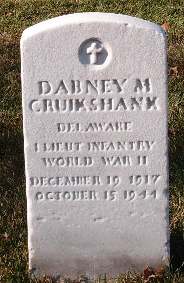 Dabney Herndon Maury Cruikshank was born on December 19, 1917 in New Castle, New Castle County, Delaware. He was the son of Harrison Cruikshank and Nan Dabney Maury Halsey Cruikshank. Dabney served in the U.S. Army during World War II as a First Lieutenant in the 1st Infantry Division. He died on October 15, 1944 and is now buried in Arlington National Cemetery, Arlington, Arlington County, Virginia, USA.