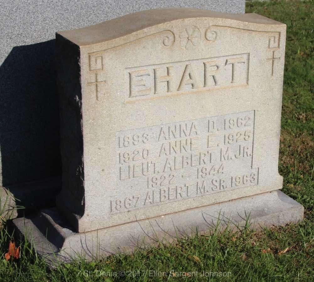 Albert M. Ehart, Jr. was born in 1922. A graduate of the Valley Forge Military Academy, class of 1941, entered the army with a second lieutenant's rating on April 25, 1942. He underwent a motor maintenance course at Fort Benning, Ga., and shortly thereafter, he was promoted to a First Lieutenant. He enlisted the army while taking a pre-medical course at Villanova College. Albert served in the U.S. Army during World War II with the 1st Infantry Division. He was Killed in Action on November 20, 1944 at the front in Germany and is now buried in Saint Denis Cemetery, Havertown, Delaware County, Pennsylvania, USA.