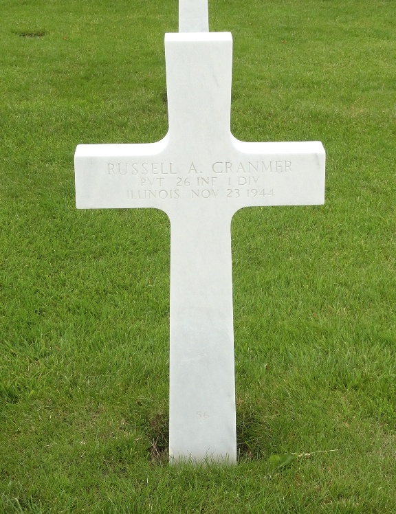 Russell A. Cranmer entered the military service in Illinois. He served in the U.S. Army during World War II as a Private in the 26th Infantry Regiment, 1st Infantry Division. He died on November 23, 1944 and is now buried in Henri-Chapelle American Cemetery, Hombourg, Belgium.