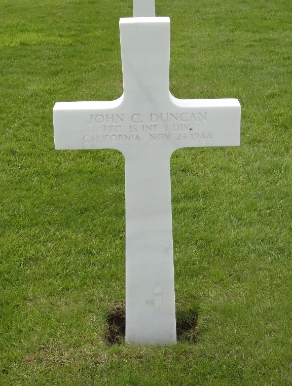 John C. Duncan entered the military service in California. He served in the U.S. Army during World War II as a Private First Class in the 18th Infantry Regiment, 1st Infantry Division. He died on November 23, 1944 and is now buried in Henri-Chapelle American Cemetery, Hombourg, Belgium.