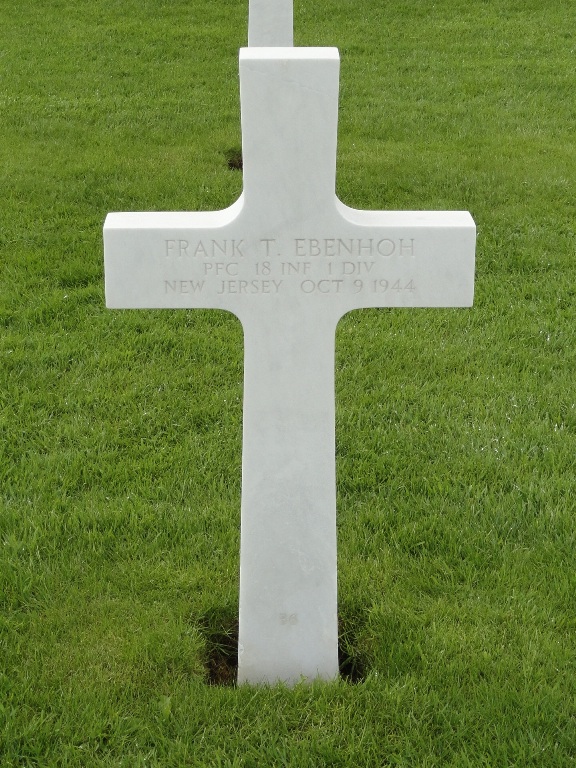 Frank T. Ebenhoh entered the military service in New Jersey. He served in the U.S. Army during World War II as a Private First Class in the 18th Infantry Regiment, 1st Infantry Division. He died on October 9, 1944 and is now buried in Henri-Chapelle American Cemetery, Hombourg, Belgium.