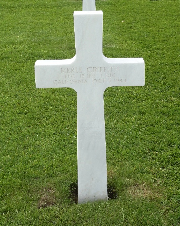 Merle Griffith entered the military service in California. He served in the U.S. Army during World War II as a Private First Class in the 18th Infantry Regiment, 1st Infantry Division. He died on October 9, 1944 and is now buried in Henri-Chapelle American Cemetery, Hombourg, Belgium.