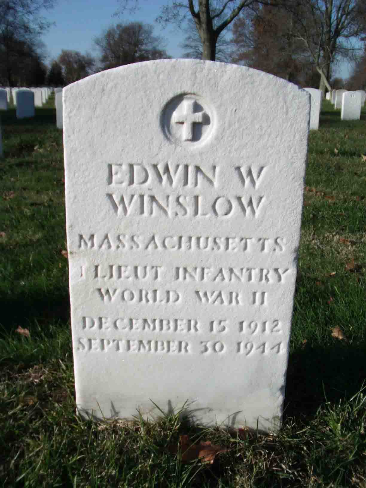 Edwin W. Winslow was born on December 15, 1912. He served in the U.S. Army during World War II as a First Lieutenant in the 1st Infantry Division. He died on September 30, 1944 at the age of 31 and is now buried in Long Island National Cemetery, East Farmingdale, Suffolk County, New York, USA.