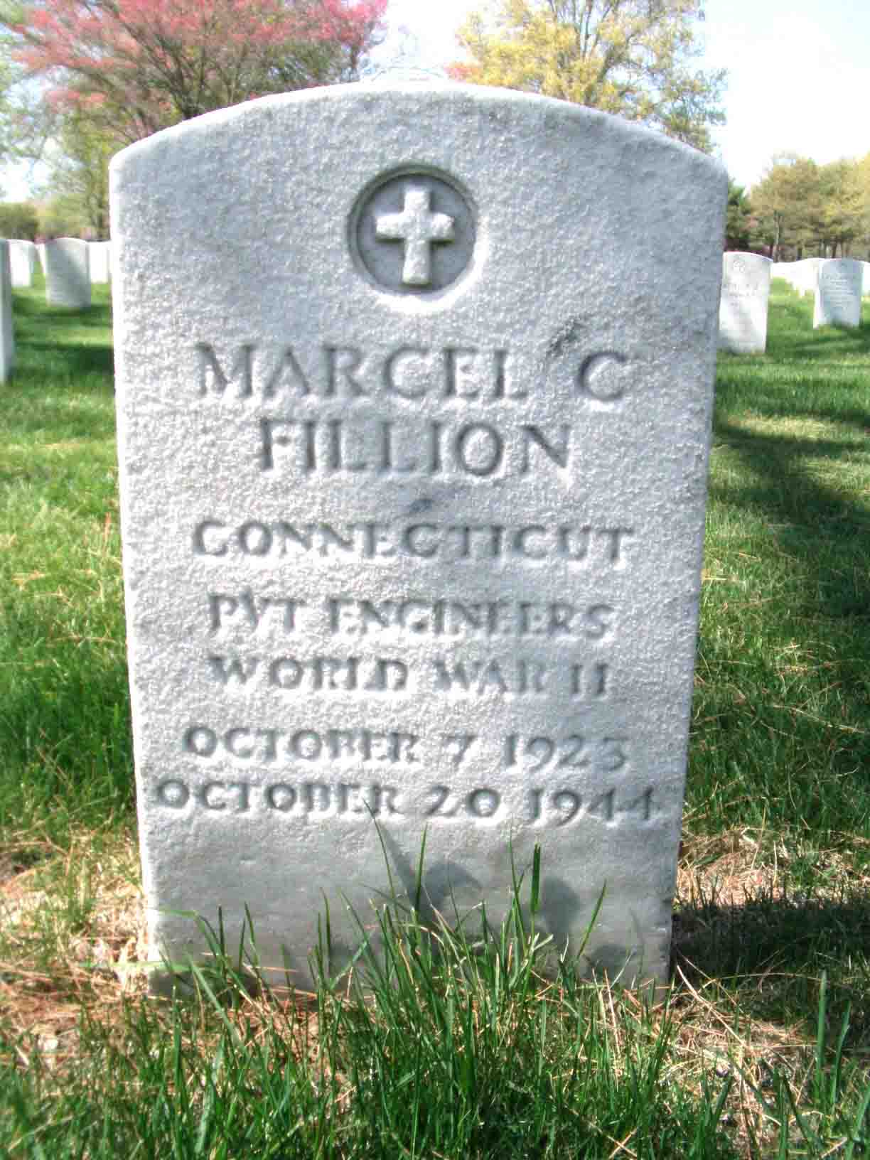 Marcel C. Fillion was born on October 17, 1923 in England. He enlisted in the Army on June 22, 1943 in Manchester, New Hampshire. He was noted, at the time of his enlistment, as being Single, without dependents. Marcel served as a Private, Engineers, U.S. Army during World War II. He resided in Coos County, New Hampshire prior to the war. He was Killed in Action on October 20, 1944 at the age of 21 and is now buried in Long Island National Cemetery, East Farmingdale, Suffolk County, New York, USA.