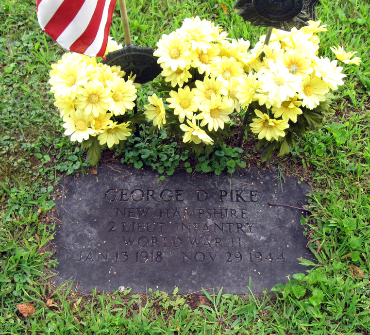 George Douglas Pike was born on January 13, 1918 in Groveton, Coos County, New Hampshire. He was the son of George Douglas Pike and Edna Lula Astle Pike. George served in the U.S. Army during World War II as a Second Lieutenant in the 26th Infantry Regiment, 1st Infantry Division. He was Killed in Action on November 29, 1944 and is now buried in Northumberland Cemetery, Northumberland, Coos County, New Hampshire, USA.