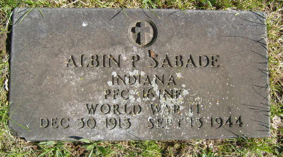 Albin P. Sabade was born on December 30, 1913. He served in the U.S. Army during World War II as a Private First Class in the 16th Infantry Regiment, 1st Infantry Division. He died on September 13, 1944 and is now buried in Fairview Cemetery, Mishawaka, St. Joseph County, Indiana, USA.