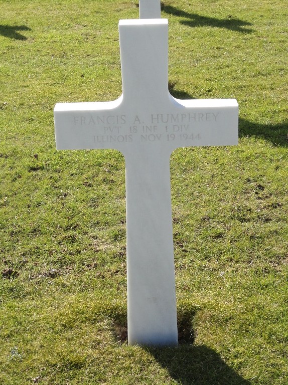 Francis A. Humphrey entered the military service in Illinois. He served in the U.S. Army during World War II as a Private in the 18th Infantry Regiment, 1st Infantry Division. He died on November 19, 1944 and is now buried in Henri-Chapelle American Cemetery, Hombourg, Belgium.