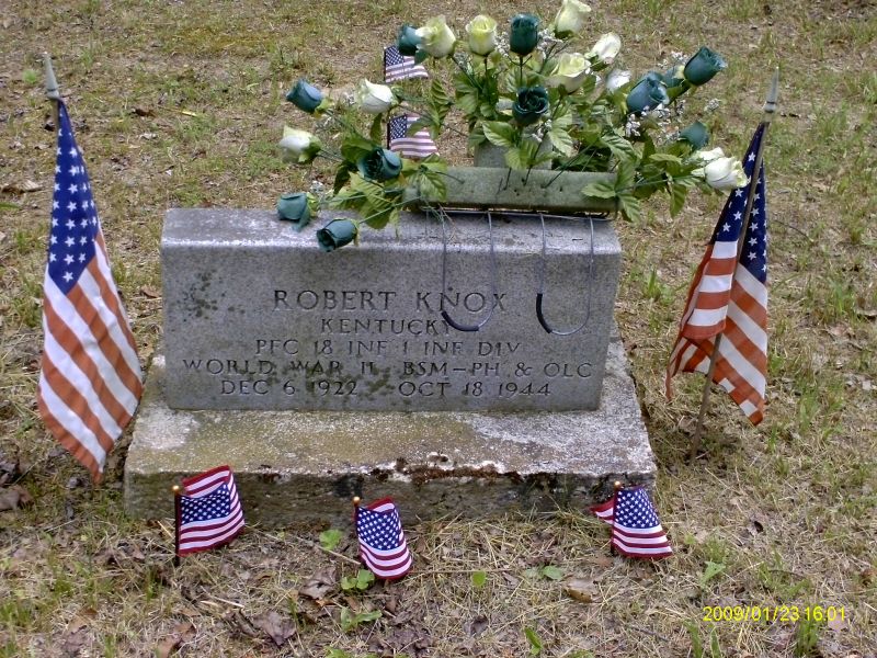 Robert Knox was born on December 6, 1922. He served in the U.S. Army during World War II as a Private First Class in the 18th Infantry Regiment, 1st Infantry Division. He died on October 18, 1944 and is now buried in Chop Chestnut Cemetery, Knowlton, Powell County, Kentucky, USA. His name is commemorated on the First Infantry monument in Henri-Chapelle, Belgium and ranked as a Private.