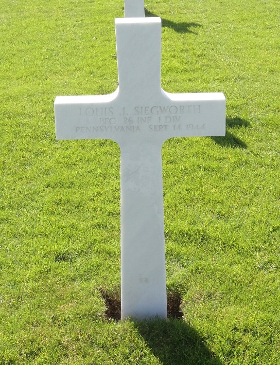 Louis J. Siegworth was born on July 5, 1917 in Aliquippa, Beaver County, Pennsylvania. He served in the U.S. Army during World War II as a Private First Class in the 26th Infantry Regiment, 1st Infantry Division. He died on September 14, 1944 in Nordrhein-Westfalen, Germany at the age of 27 and is now buried in Henri-Chapelle American Cemetery, Hombourg, Belgium.