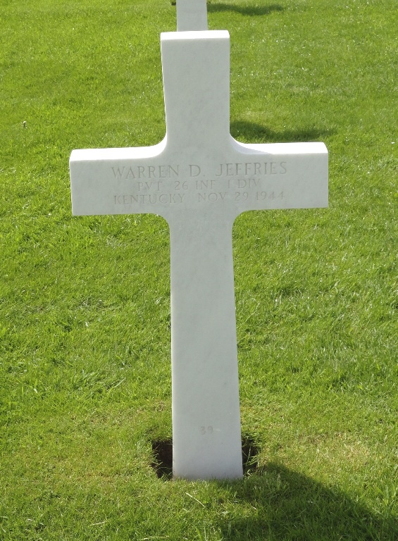 Warren D. Jeffries entered the military service in Kentucky. He served in the U.S. Army during World War II as a Private in the 26th Infantry Regiment, 1st Infantry Division. He died on November 29, 1944 and is now buried in Henri-Chapelle American Cemetery, Hombourg, Belgium.