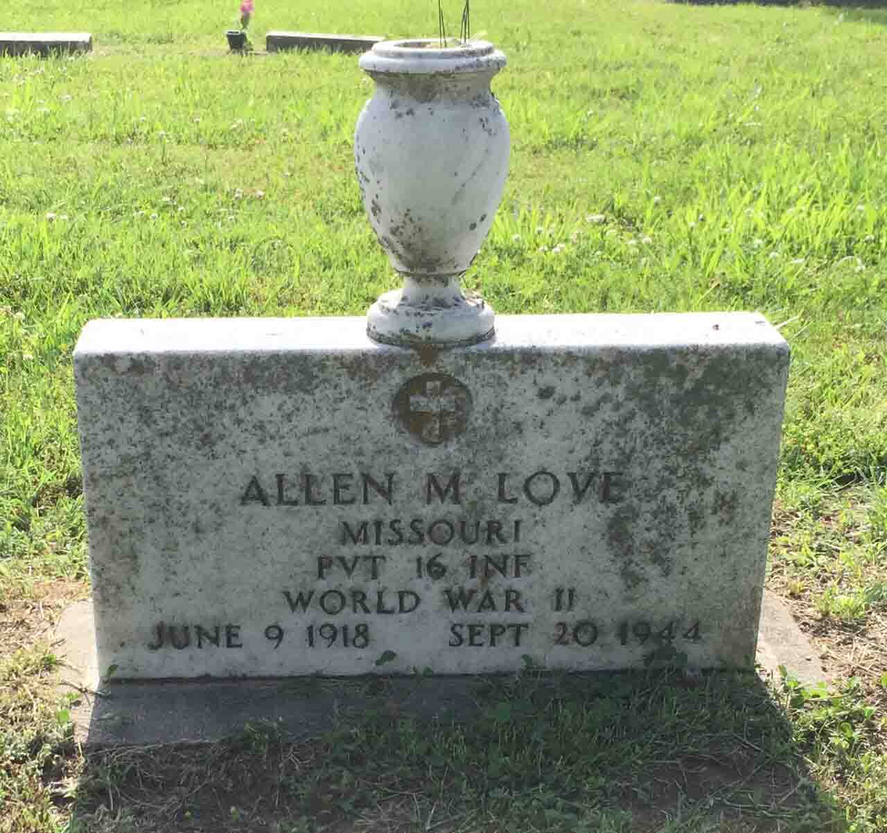 Allen M. Love was born on June 9, 1918 in Colorado. He was the son of Charles Allen Love and Pearl Anna Morrell Love. Allen served in the U.S. Army during World War II as a Private in the 16th Infantry Regiment, 1st Infantry Division. He was Killed in Action on September 20, 1944 in Germany at the age of 26 and is now buried in Memorial Park Cemetery, East Prairie, Mississippi County, Missouri, USA.