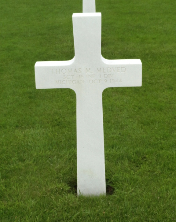 Thomas M. Medved entered the military service in Michigan. He served in the U.S. Army during World War II as a Sergeant in the 16th Infantry Regiment, 1st Infantry Division. He died on October 9, 1944 and is now buried in Henri-Chapelle American Cemetery, Hombourg, Belgium.