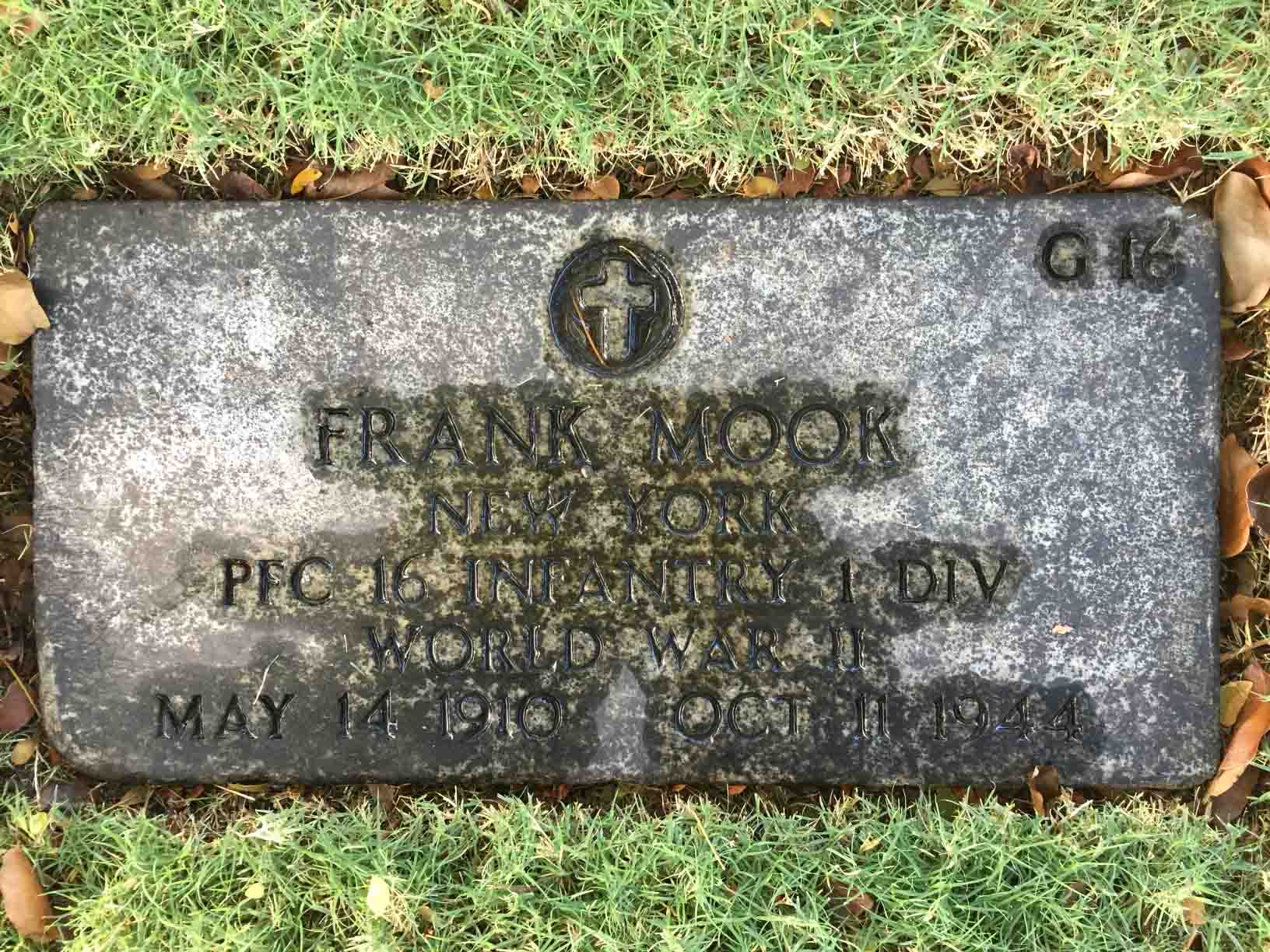 Frank Mook was born on May 14, 1910. He entered the military service in New York and served in the U.S. Army during World War II as a Private First Class in the 16th Infantry Regiment, 1st Infantry Division. He died on October 11, 1944 at the age of 34 and is now buried in National Memorial Cemetery of the Pacific, Honolulu, Honolulu County, Hawaii, USA.