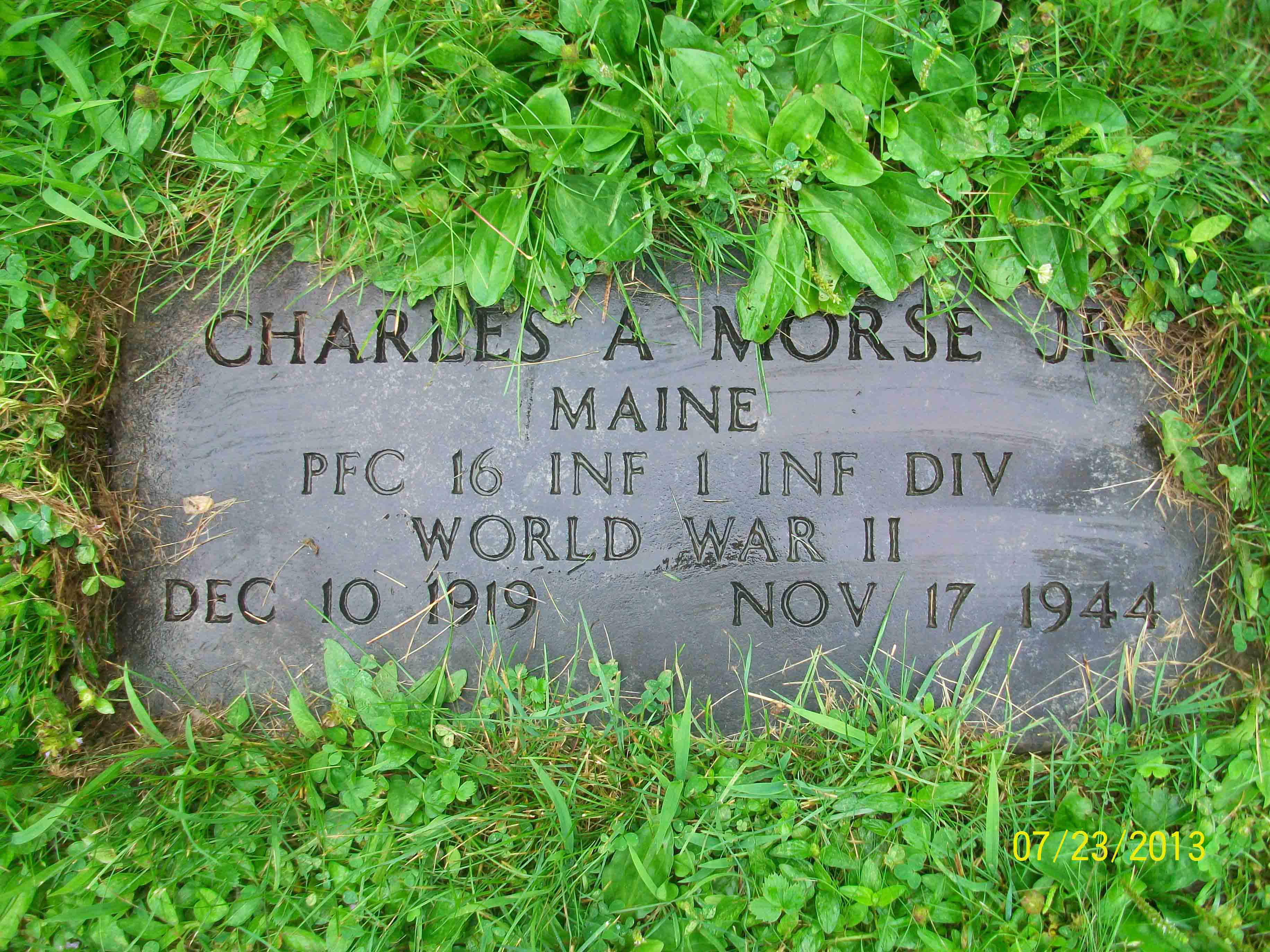 Charles Alfred Morse, Jr. was born on December 10, 1919 in Maine. He enlisted in the Army on February 26, 1942 at Fort Devens, Massachusetts. He was noted, at the time of his enlistment, as being employed as a Roofer and also as Single, without dependents. Charles served as a Private First Class, 16th Infantry, 1st Infantry Division, U.S. Army during World War II. He resided in Androscoggin County, Maine prior to the war. Charles was "Killed In Action" in the Battle of Hurtgen Forest, Germany during the war and is now buried in Grand Army of the Republic Cemetery, Lewiston, Androscoggin County, Maine, USA.