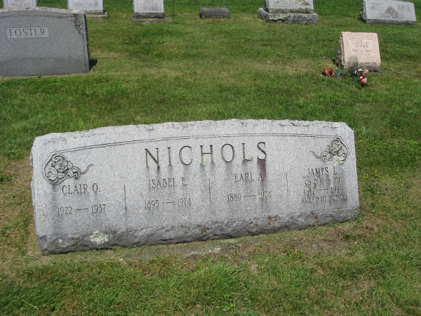James L. Nichols was born in 1917. He was the son of Earl A. Nichols and Isabel E. Childs Nichols. James served in the U.S. Army during World War II as a Private First Class in the Company D, 16th Infantry Regiment, 1st Infantry Division. He was Killed in Action in 1944 and is now buried in West Genesee Cemetery, Obi, Allegany County, New York, USA.