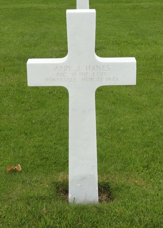 Arry J. Hanes entered the military service in Tennessee. He served in the U.S. Army during World War II as a Private First Class in the 18th Infantry Regiment, 1st Infantry Division. He died on November 27, 1944 and is now buried in Henri-Chapelle American Cemetery, Hombourg, Belgium.