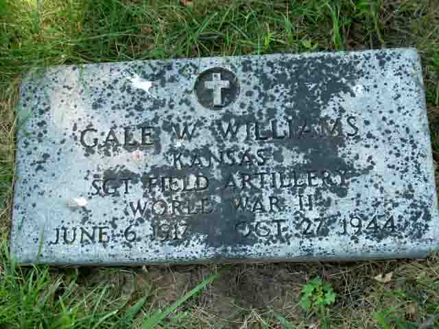 Gale Worth Williams was born on June 6, 1917 in Russell, Russell County, Kansas. He was the son of Francis Worth Williams and Margaret Louise Henning Williams. Williams graduated from Seaman High School in 1935. He was a graduate of Strickler's Business College and was employed at the Topeka State Bank before he entered the service with the National Guard in December, 1940. Gale served in the U.S. Army during World War II as a Sergeant in the Field Artillery of the 1st Infantry Division. He was Killed in Action on October 27, 1944 in Germany at the age of 27 and is now buried in Memorial Park Cemetery, Topeka, Shawnee County, Kansas, USA.