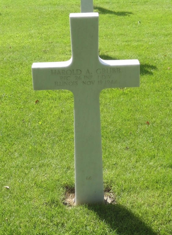 Harold A. Grubb entered the military service in Illinois. He served in the U.S. Army during World War II as a Private First Class in the 26th Infantry Regiment, 1st Infantry Division. He died on November 19, 1944 and is now buried in Henri-Chapelle American Cemetery, Hombourg, Belgium.
