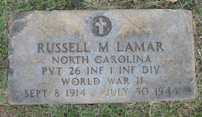 Russell M. Lamar was born on September 8, 1914. He was the son of Gary McKinney Lamar and Mattie Ellen Pruitt Lamar. He graduated from Leaksville high school and took one year in North Carolina State Textile college, Raleigh. He entered the service on October 20, 1943, took 17 weeks' basic training at Camp Fannin, Texas, and was transferred to Fort George Meade, Md., on March 5, 1944. He went to England in April. Russell served in the U.S. Army during World War II as a Private in the 26th Infantry Regiment, 1st Infantry Division. He took part in the heavy fighting on the shores of Normandy and later in the more advanced positions inland. He was Killed in Action on July 30, 1944 in France at the age of 29 and is now buried in Woodlawn Cemetery, Spray, Rockingham County, North Carolina, USA.