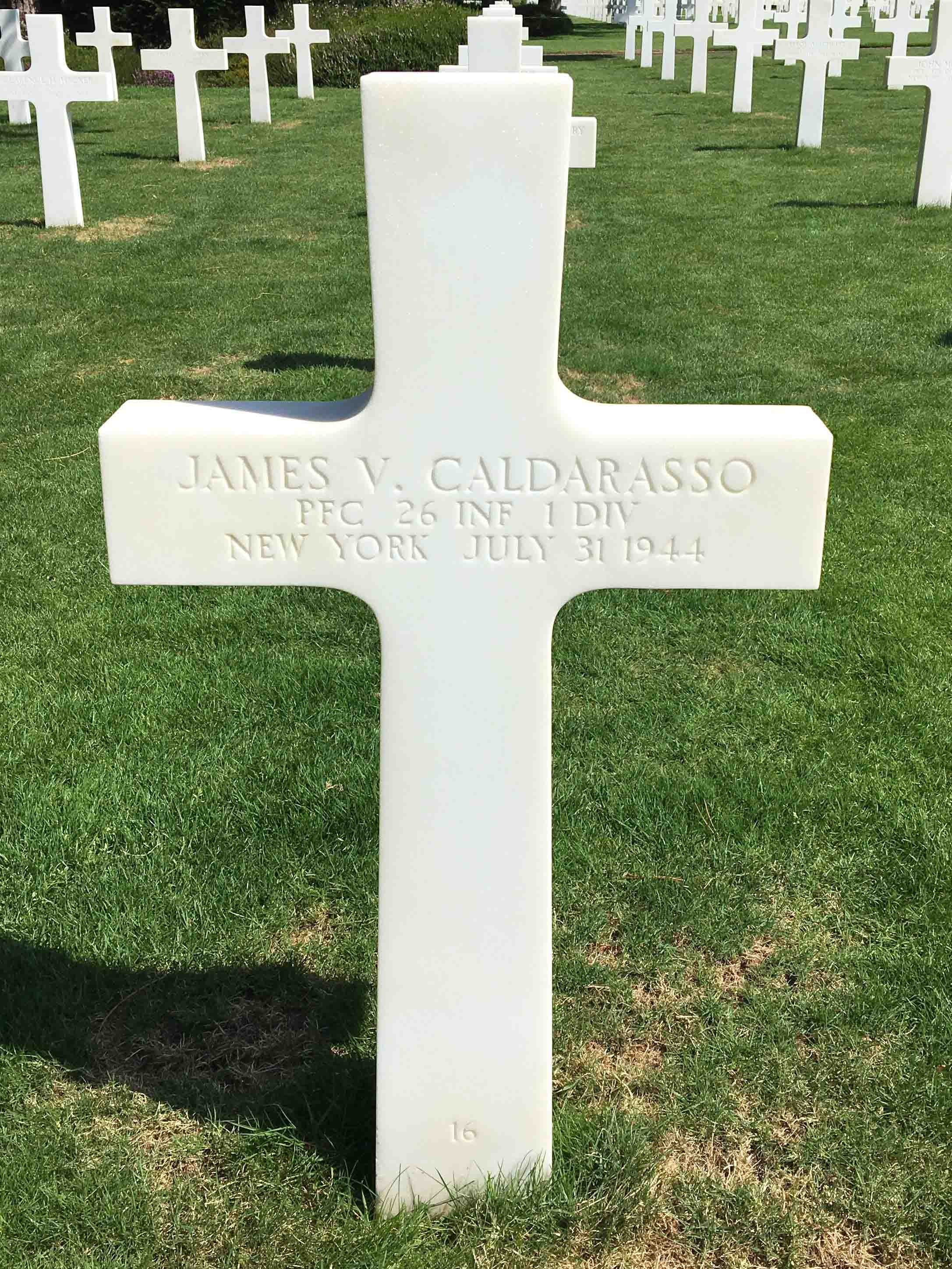 James V. Caldarasso entered the military service in New York. He served in the U.S. Army during World War II as a Private First Class in the 26th Infantry Regiment, 1st Infantry Division. He died on July 31, 1944 and is now buried in Normandy American Cemetery, Colleville-sur-Mer, France.