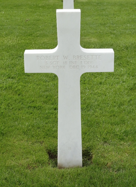 Robert W. Bresette entered the military service in New York. He served in the U.S. Army during World War II as a Staff Sergeant in the 18th Infantry Regiment, 1st Infantry Division. He died on December 19, 1944 and is now buried in Henri-Chapelle American Cemetery, Hombourg, Belgium.