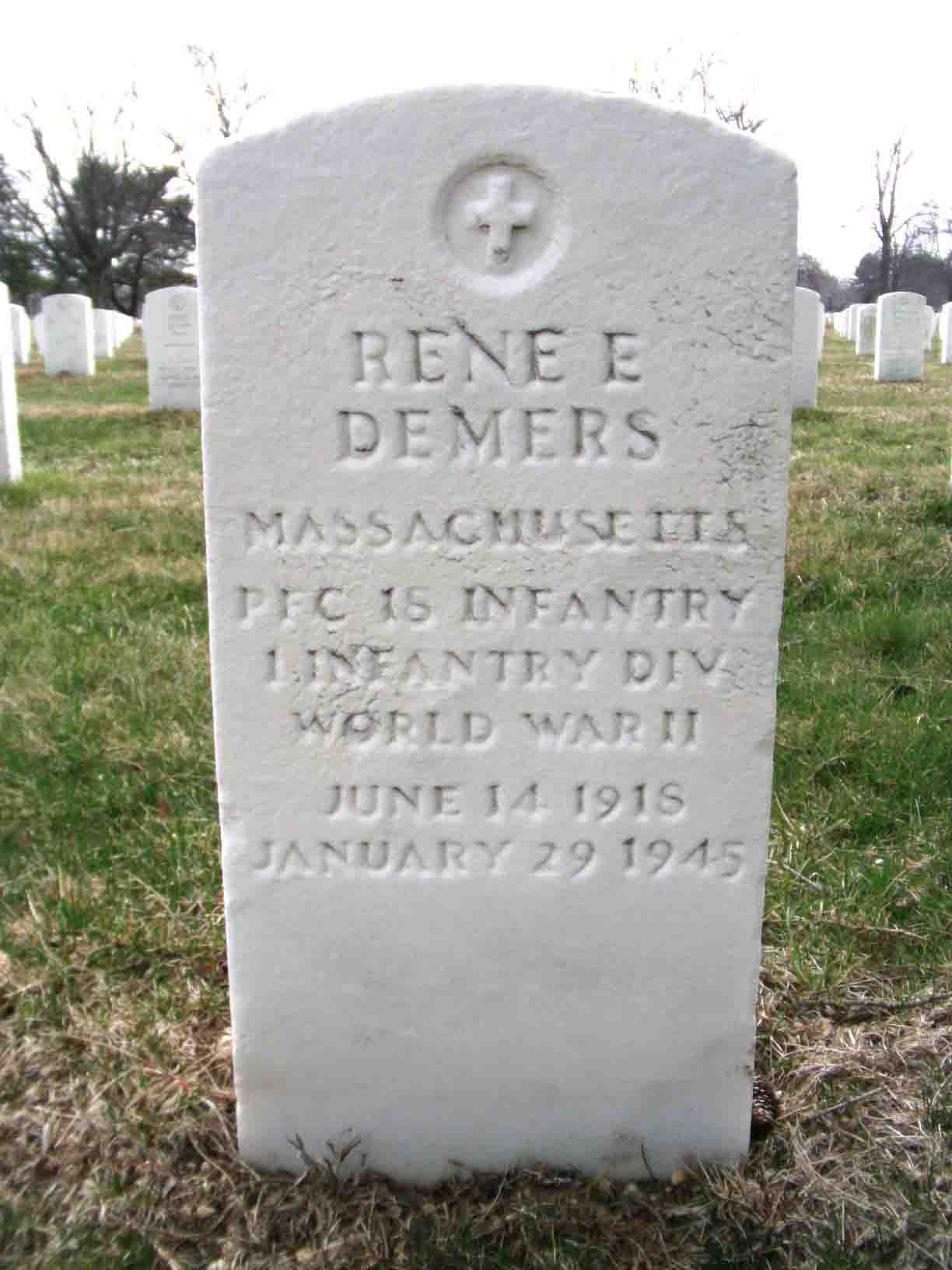 Rene E. Demers was born on June 14, 1918. He served in the U.S. Army during World War II as a Private First Class in the 18th Infantry Regiment, 1st Infantry Division. He died on January 29, 1945 at the age of 26 and is now buried in Long Island National Cemetery, East Farmingdale, Suffolk County, New York, USA.