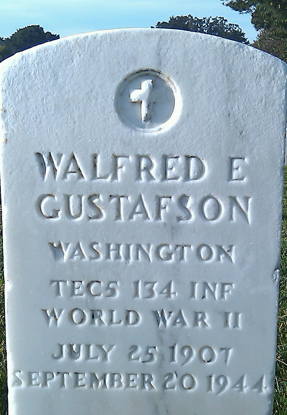 Walfred E. Gustafson was born on July 25, 1907. He was the son of Leonard Gustafson and Jennie L. Gustafson. Walfred served in Company A, 134th Infantry Regiment, 35th Infantry Division as a Technician Fifth Grade during World War II. He died on September 20, 1944 at the age of 37 during the battle for liberation of Agincourt, France and is now buried in the Golden Gate National Cemetery, San Bruno, San Mateo County, California, USA.