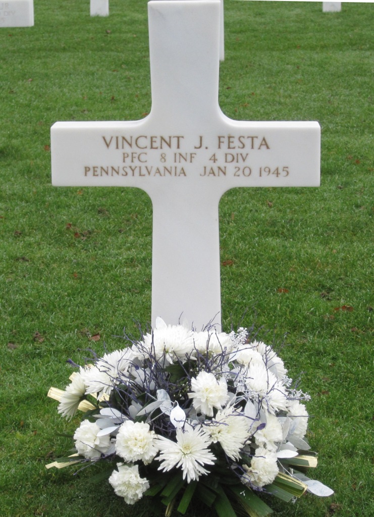Vincent J. Festa was born in Pennsylvania to Mary. He entered the military service in Pennsylvania and served in the 8th Infantry Regiment, 4th Infantry Division as a Private First Class during World War II. He died on January 20, 1945 in Luxembourg at the age of 28 and is now buried in the Luxembourg American Cemetery, Luxembourg.