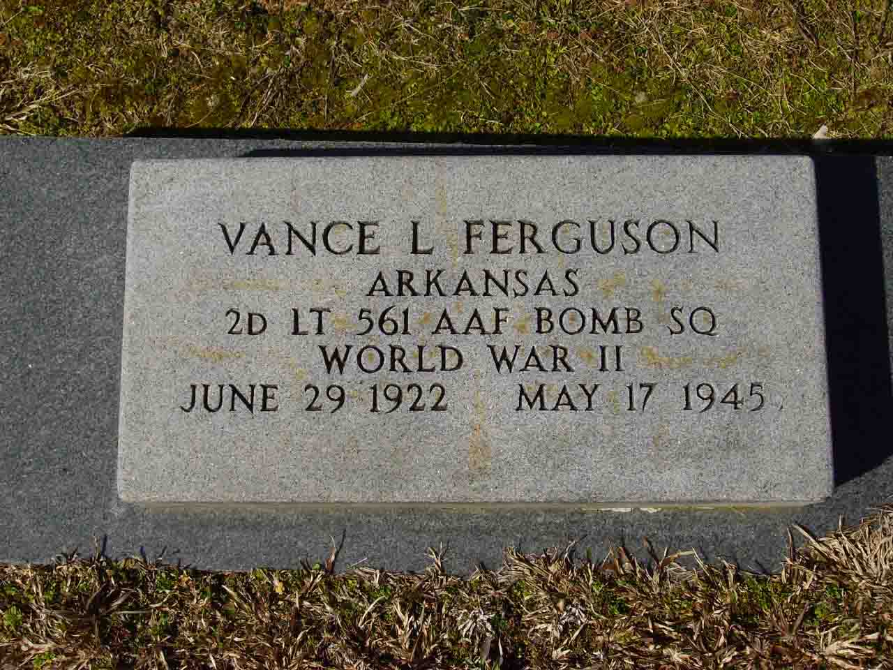 Vance Lamar Ferguson was born on June 29, 1922. He was the son of Robert Lee and Carrie Karl Givens Ferguson. he served in the 561st Bomber Squadron, 388th Bomber Group, Heavy as a Second Lieutenant and Co-Pilot of #43-38782 "Ready Maid / Caprice W" aircraft during World War II. Vance died on May 17, 1945 at the age of 22 and is now buried in the Gravel Ridge Cemetery, Gravelridge, Bradley County, Arkansas, USA. He was one of the many brave Americans of the 388th Bomber Group who lost their lives in aerial operations against the German forces from June 1943 - August 1945.