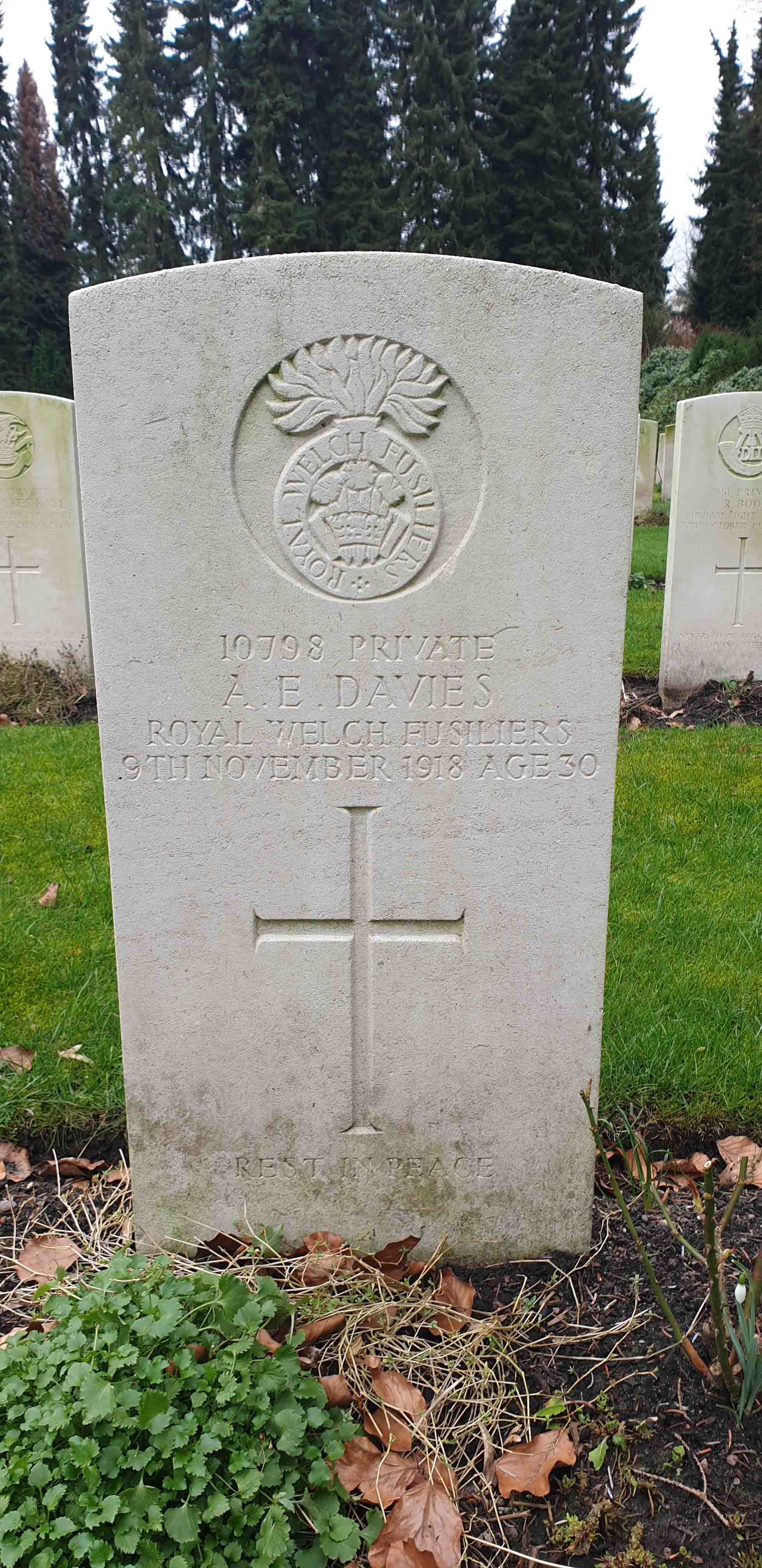 Arthur E. Davies was the son of Martha Davies; husband of Elizabeth Davies of Brooklyn, New York. He served in the 1st Battalion, Royal Welsh Fusiliers as a Private during World War I. He is now buried in the Ohlsdorf Cemetery, Ohlsdorf, Hamburg-Nord, Hamburg, Germany.