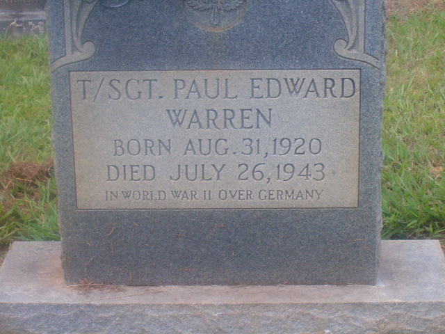 Paul Edward Warren was born in Carthage, North Carolina on August 31, 1920. He was the son of James L. and Martha Jane Nall Warren. He was trained as an aerial gunner and was assigned to a B-17 combat crew. This crew was assigned to the 563rd Bomb Squadron of the 388th Bomb Squadron operating from Knettishall, England. The crew, headed by Lt Bobbitt, flew on 4 combat missions beginning on July 17, including the 24th, 25th, and terminating on 26, 1943. The last mission was to raid the German war facilities at Hannover, Germany.