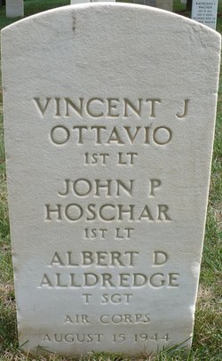 Albert D. Alldredge was the Radio Operator and Machine Gunner of the B-25 s/n 43-27783 6T that took off from Alesan in Corsica and flew in formation as the number 4 plane in the first box on the way to France. Just before dropping its bomb load, it was hit by flak on the left wing, between the fuselage and the motor. The plane lost the wing and was quickly engulfed in flames. The crew had no chance to escape the falling plane and all six of them perished. He is buried in the same grave with 1Lt Ottavio and 1Lt Hoschar. Albert also has a cenotaph located in Sunset Hills Cemetery, Flint, Genesee County, Michigan.