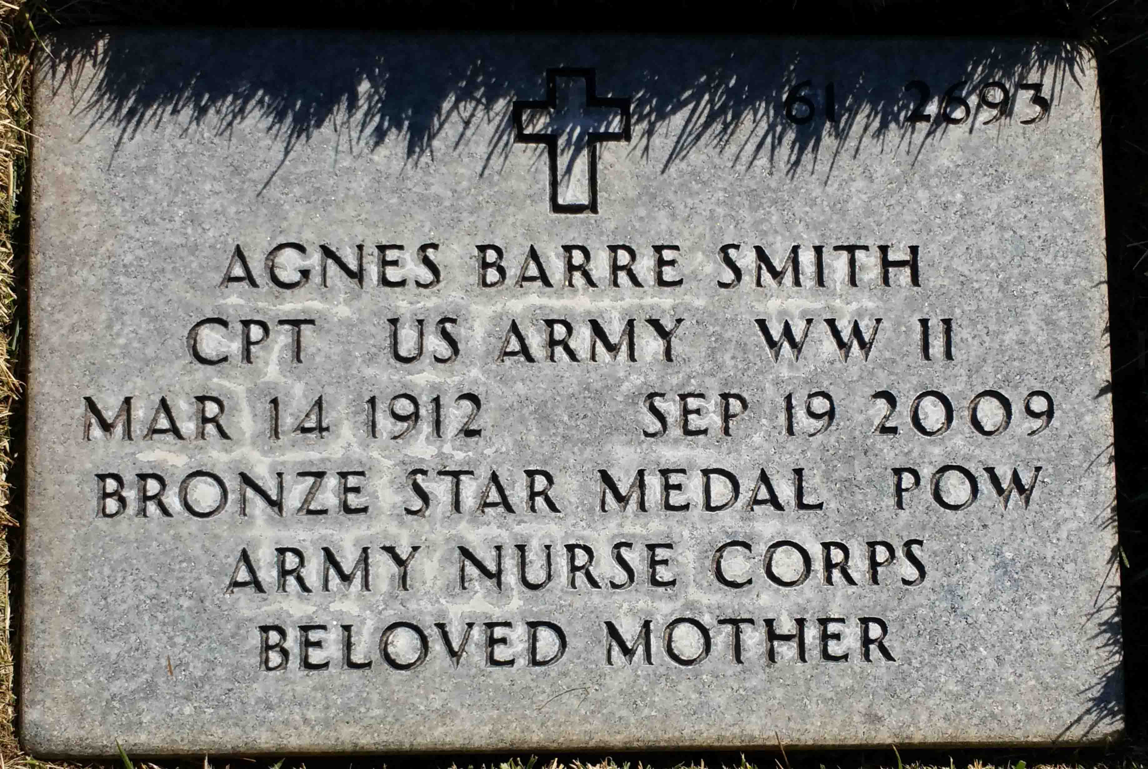 Agnes D. Barre Smith was born on March 14, 1912. She was the daughter of Valentin Barre and Dores Josephine Guidry Barre. Agnes served in the US Army as a Second Lieutenant during World War II. She was one of the "Angels of Bataan and Corregidor” – the US Army and Navy Nurse Corps women who served in the Battle of the Philippines in 1941-42. When Bataan and Corregidor fell, 11 Navy nurses, 66 army nurses, and 1 nurse-anesthetist were captured and imprisoned in and around Manila. They continued to serve as nurses in various POW camps until they were finally liberated in February 1945. Agnes died on September 19, 2009 at the age of 97 and is now buried in the Riverside National Cemetery, Riverside, Riverside County, California, USA with the rank of Captain on her headstone.