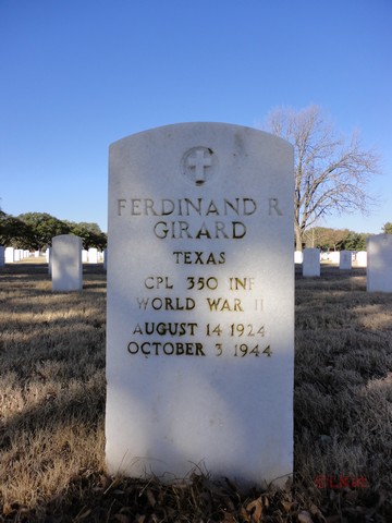 Ferdinand Rudy Girard was born on August 14, 1924 in San Antonio, Texas. He served in the US Army as a Corporal during World War II. He died on October 3, 1944 at the age of 20 in Italy and is now buried in the Fort Sam Houston National Cemetery, San Antonio, Bexar County, Texas, USA. A member of the 2nd Battalion, 350th Infantry Regiment, his unit was cited for outstanding performance of duty in action during the period 27 September to 3 October 1944 at Mt. Battaglia, Italy against German forces. For seven days, amidst powerful counterattacks, the men of the battalion repulsed each attack with fighting ability and teamwork, therefore, their objective was accomplished.