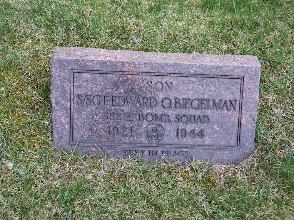 Edward O. Biegelman was born on February 13, 1921 in Ohio. He was the son of Edward Biegelman and Lydia Pansigraw Biegelman. He served in the 552nd Bomber Squadron, 386th Bomber Group, Medium, as a Staff Sergeant and Radio Operator on the B-26 Marauder #43-34318 during World War II.
