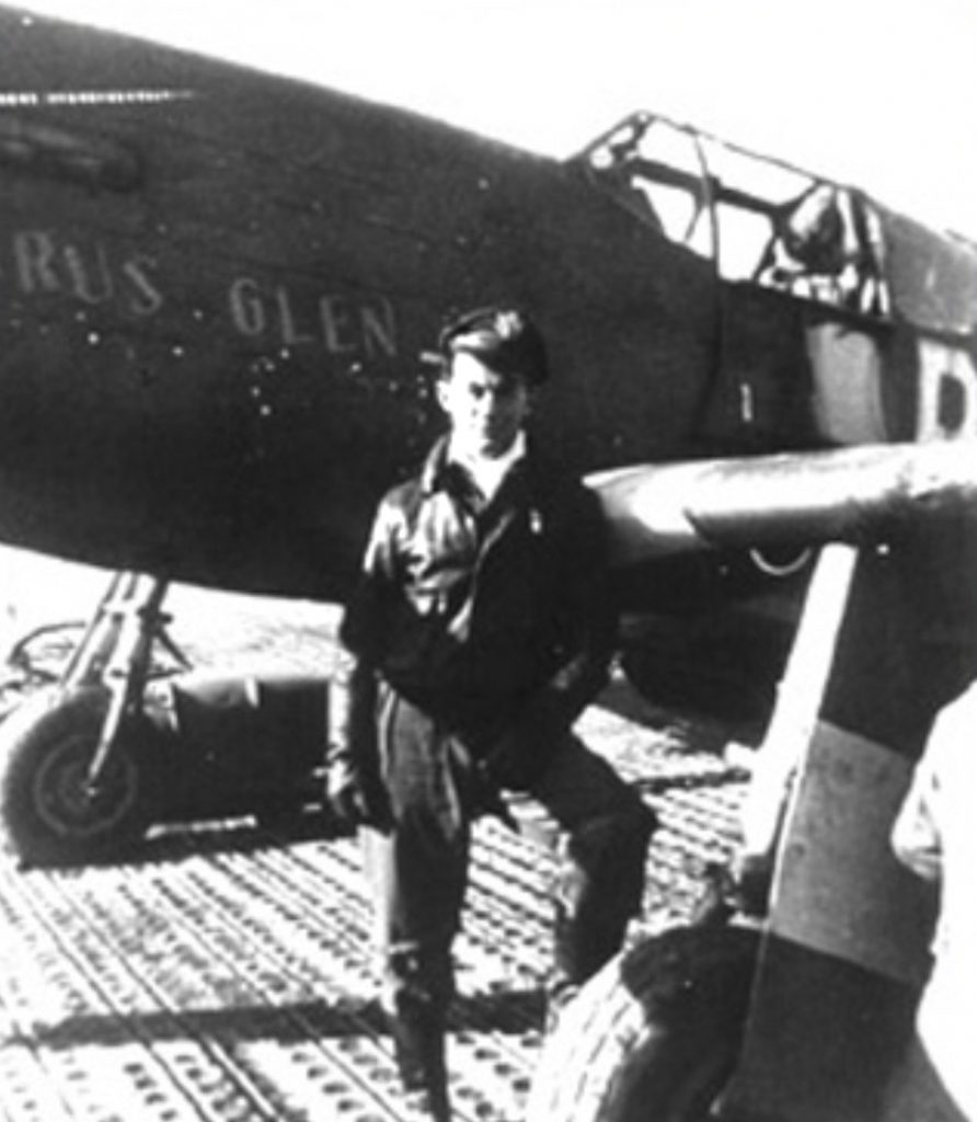 He flew P-51 Mustang fighters in the European theater during World War II, and in March 1944, on his eighth mission, he was shot down over France by a German fighter plane and parachuted into woods with leg and head wounds. But he was hidden by members of the French underground, made it to neutral Spain by climbing the snowy Pyrenees, carrying a severely wounded flier with him, and returned to his base in England.