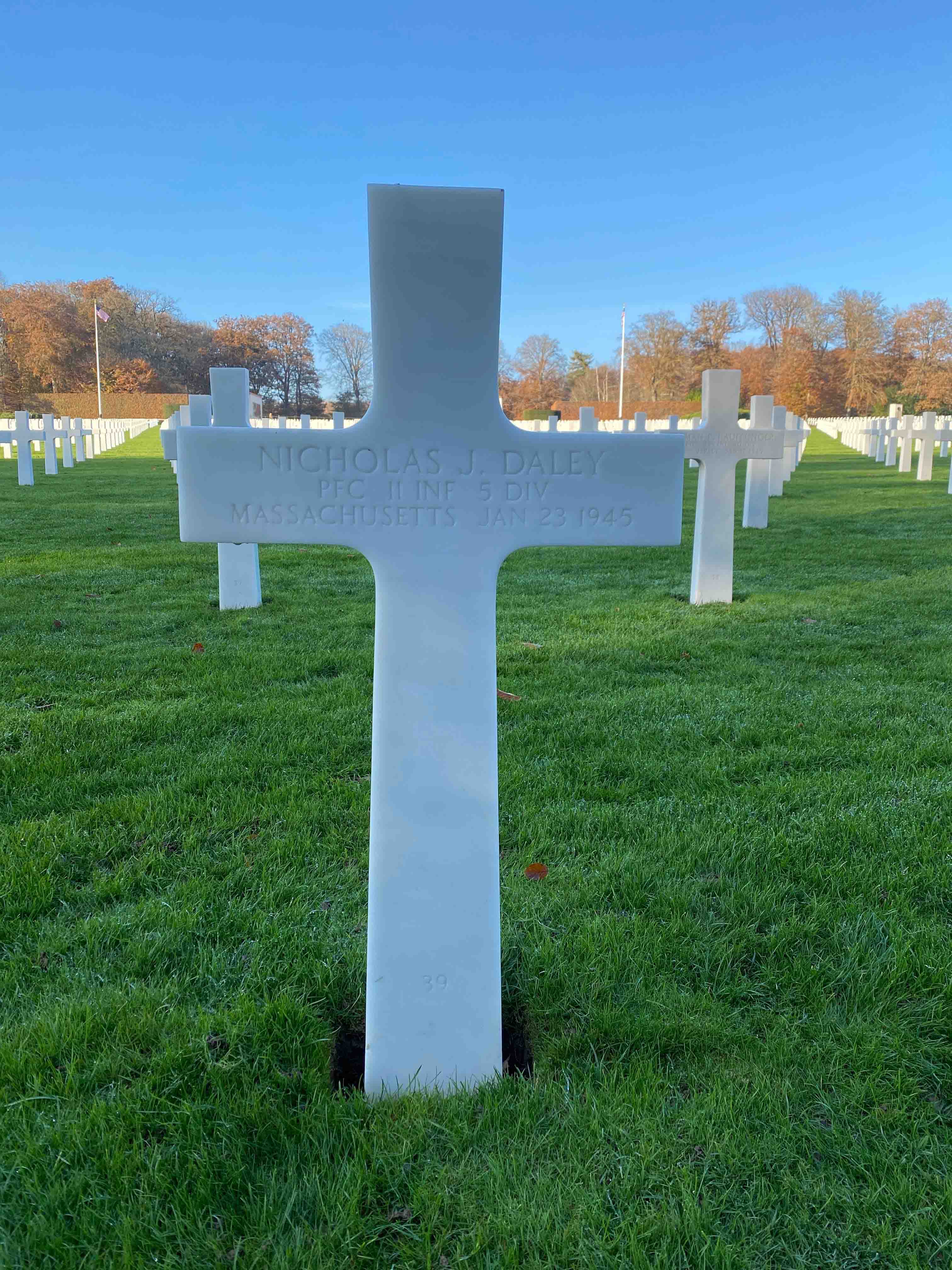 Nicholas J. Daley entered the military service in Massachusetts. He served in the 11th Infantry Regiment, 5th Infantry Division as a Private First Class during World War II. He died on January 23, 1945 and is now buried in the Luxembourg American Cemetery, Luxembourg. PFC Daley was one of the 38 American soldiers killed during the fierce fighting at sub-zero temperatures to recapture the town of Hoscheid, Luxembourg. His name is commemorated on the Peace Garden information boards located at Hoscheid, Luxembourg but his name is spelled Nickolas.