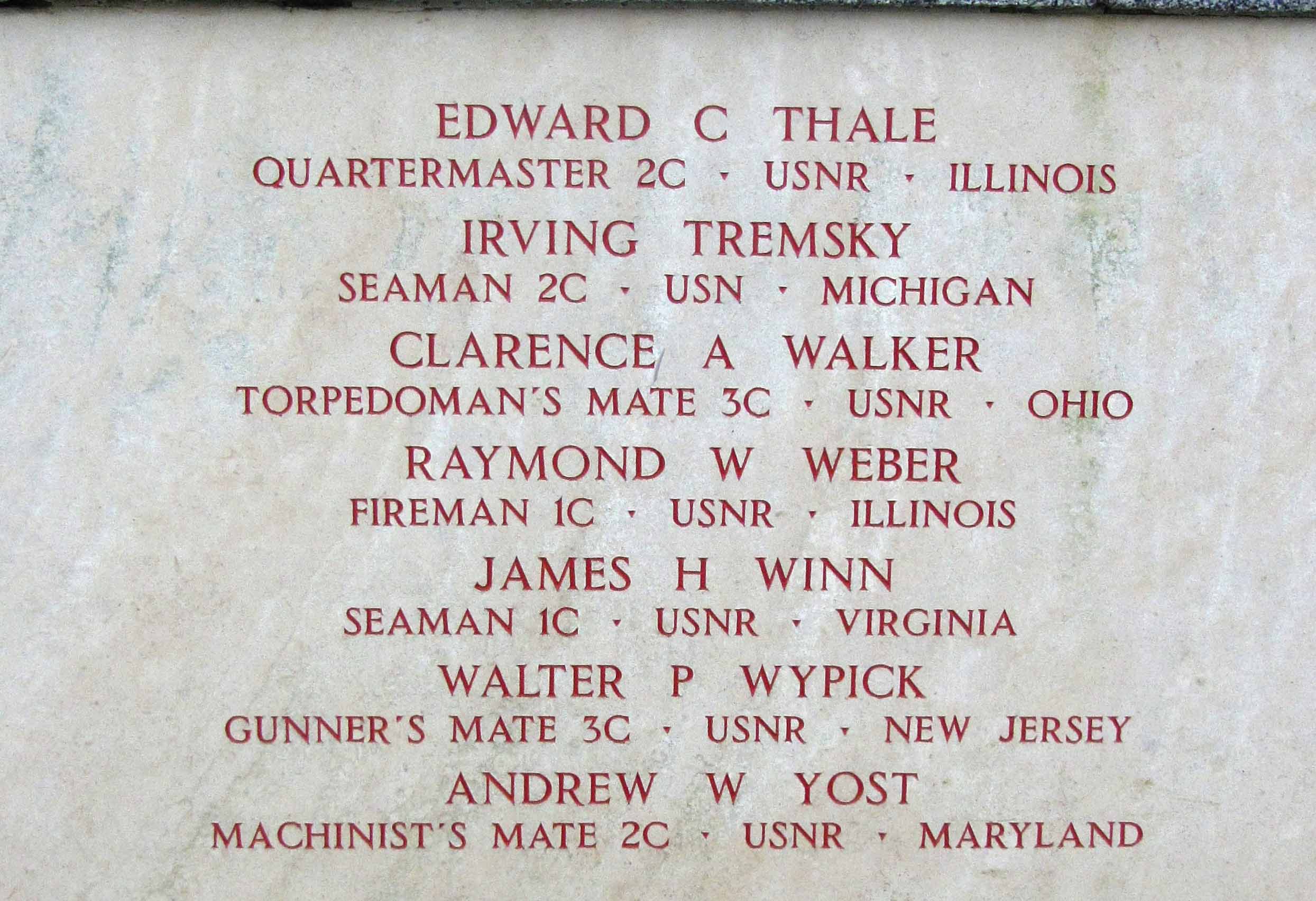 QM2 Thale's remains were never recovered and he was declared Missing in Action on August 10, 1945. His name is memorialized at the Tablets of the Missing, Brittany American Cemetery, Montjoie Saint Martin, France.