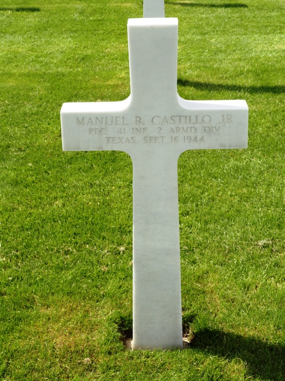 Manuel Rangel Castillo, Jr. was born on January 19, 1925, in Mexico. He served in the 41st Armored Infantry Regiment, 2nd Armored Division, as a Private First Class during World War II. He died on September 16, 1944, and is now buried in the Henri-Chapelle American Cemetery, Hombourg, Belgium. Pfc Castillo was one of the 65 soldiers killed in battle during the liberation of the Limburg region of the Netherlands and Belgium.