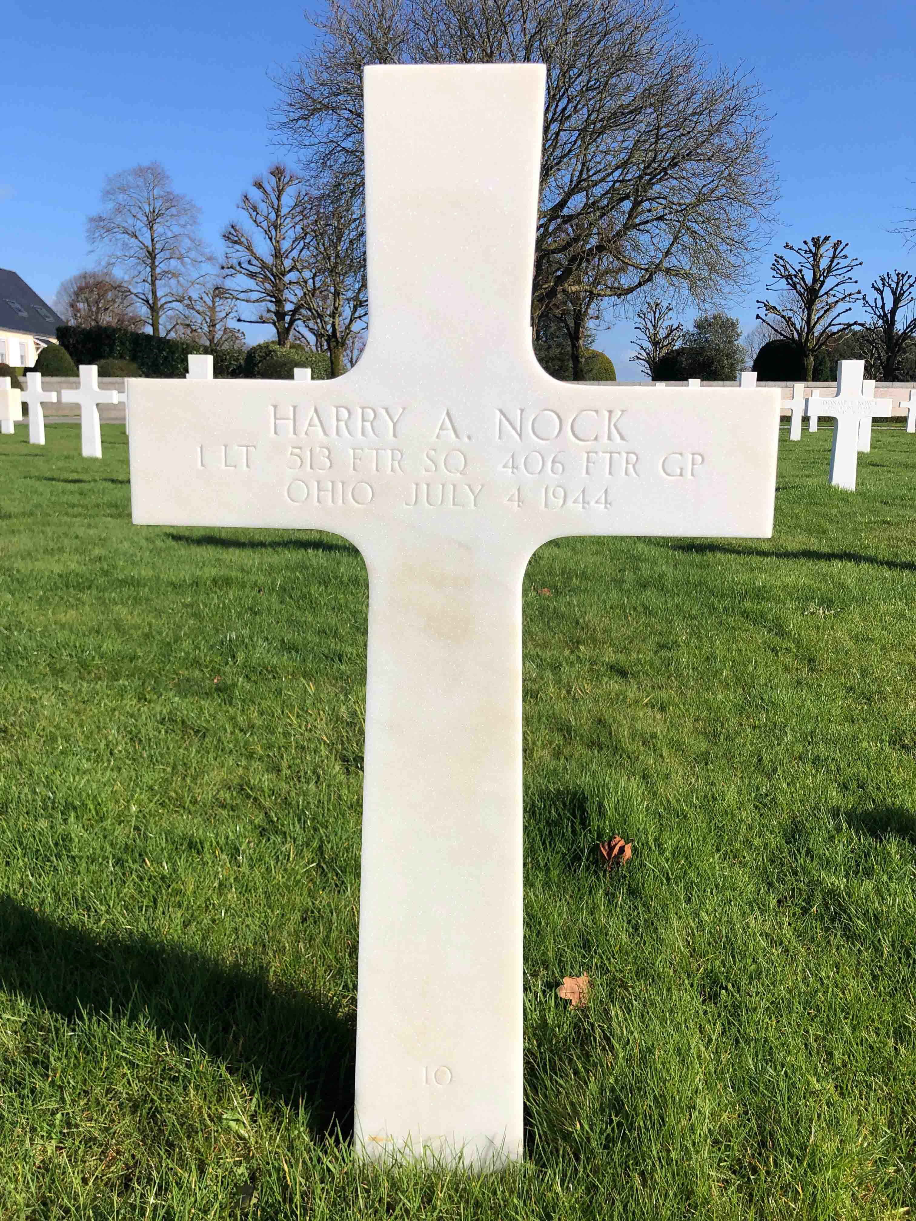 Harry served in the 513th Fighter Squadron, 406th Fighter Group, as a First Lieutenant and Pilot of the P-47 D-20-RE #42-76416 during World War II. On July 4, 1944, he took off from Station 417 airfield in Ashford, England, on an armed reconnaissance mission to Avranches, France. He was Killed in Action when his aircraft was shot down in aerial combat by over 30 Fw190. His airplane crashed between Coutances and Vire around 14:00. He is now buried in the Brittany American Cemetery, Montjoie Saint Martin, France.